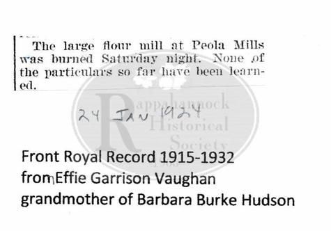 Description: Front Royal Record newspaper item on the fire which destroyed Peola Mills in Rappahannock County in January 1924.