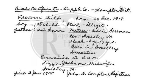 Description: Abstract of the birth record of the first child of Sissy Freeman. Her son was born December 29, 1914 in Smedley, VA. Lizzie Jackson was the midwife.